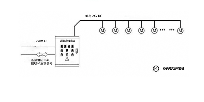 ・ 如果发生火灾既无外接电源情况下又要实现消防联动功能时,需要楼宇原有消防中心提供 220V 消防电源 给到消防控制箱,实现消防排烟窗功能。